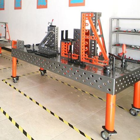 焊接工作臺是一種多用途焊接工裝平臺工藝裝備集焊接,裝配,檢驗為一體.具有三維柔性組合焊接工裝夾具同樣的互換性,通用性,經(jīng)濟性等優(yōu)點;與普通平板焊臺對比可以提高工作效率,節(jié)省原材料,節(jié)省資金;使用過程中可選擇多樣式的三維組合標(biāo)準(zhǔn)夾具配件進行夾緊定位加工作業(yè),操作簡單、使用方便。為產(chǎn)品快速上市贏得競爭機遇.默認(rèn)為D28系列,孔徑D28mm,孔距100mm;表面平面度高達(dá)0.05/1000mm,硬度可達(dá)38-45HRC,可做作為焊接過程中產(chǎn)品檢驗平臺使用。同時它具有定位準(zhǔn)確,拆卸方便,互換性高等特點,為焊接行業(yè)提供了一種標(biāo)準(zhǔn)化的柔性焊接工藝裝備,改變焊接車間傳統(tǒng)的落后面貌,是焊工的好幫手,是焊接車間的環(huán)寶的象征,為公司7S工作提供強有力保證。同時也為機器人代替人工打好了堅實的基礎(chǔ)。